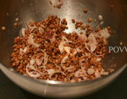 Pel en snijd de sjalotten. Meng ze met gekookte linzen, de ciderazijn en 2 el olijfolie. Kruid met suiker, peper en zout.