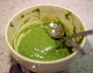 Schep het bloem-suikermengsel met de spatel voorzichtig door het eiwit. Schep de pistachepasta op het einde in en roer voorzichtig door de mengsel.