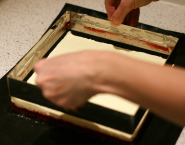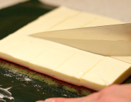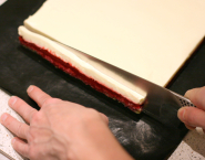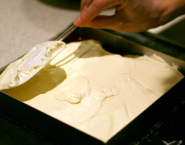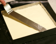 Verwarm de bakvorm met een föhn om te voorkomen dat de schüss bij het verwijderen aan de vorm blijft plakken. Of bekleed de wanden van de vorm met stukjes stevig rhodoïd (plastic).