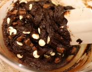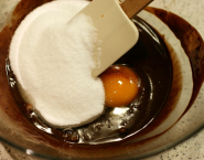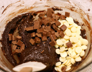 Pridaj celé vajce a cukor a dobre vymiešaj. Pridaj kakaový prášk a múku zmiešanú s práškom do pečiva. Keď je zmes homogénna, pridaj kúsky bielej a pralinkovej čokolády a znova dobre premiešaj.