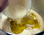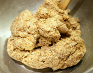Zmiešaj droždie s trochou vody. Potom všetky ingrediencie zmiešaj spolu v mise a dôkladne vymies do cesta. Ak je cesto suché, pridaj vodu po troškách (alebo si ruky namoč do vlažnej vody a chlieb nimi mies, až budú suché). Množstvo vody v recepte je len orientačné, pretože savosť každej múky je odlišná.