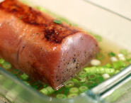 Po upečení mäso z pekáča vyber, zabaľ do alobalu a nechaj odpočinúť. Šťavu z výpeku prelej do rajnice, pridaj tmavú instantnú majonézu a zavar omáčku. Dochuť podľa potreby soľou a korením.