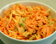 Mrkvu ostrúhak na hrubšie, zeler na jemno a jablko na tenké rezance (julienne). Všetko spolu premiešaj, pridaj olivovú majonézu a dochuť soľou a korením a premiešaj.