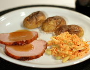 Podávaj so zeleninovým šalátom a zemiakmi na ľubovoľný spôsob. Je kan het vlees snijden en ofwel opnieuw in de saus leggen of apart serveren. Als je apart serveert kun je een klein beetje saus erover napperen.