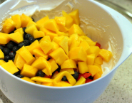 Potrebovala som len 90 g tejto peny na iný dezert. Tak som do zvyšku nakrájala ovocie a dezert bol na svete. Kto je na diéte, nech fotopostup radšej ani nepozerá. Dezertík bol naozaj prudko jedlý. Myslím, že najbližší mesiac nepotrebujem jesť žiadne sladkosti.