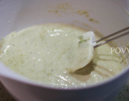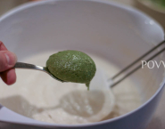 Primiešavaj postupne cukrovo-múčnu zmes špachtičkou do snehu. Nakoniec pridaj pistáciovú pastu a opatrne to celé premiešaj.