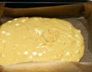 Zvyšnú čokoládu nasekaj na hrubšie kúsky a primiešaj do cesta. Cesto uprav na plech na pečenie. Peč 20-30 minút (v závislosti od typu rúry). Koláč nechaj vychladnúť vo forme a potom ho z nej vyber.