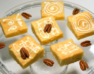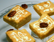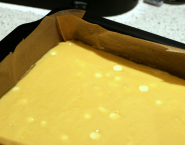 Roztop malé množstvo extra čokolády v bain-marie a povrch koláča postriekaj pozdĺžnymi pruhmi. Nechaj stuhnúť a koláč nakoniec nakrájaj na kúsky o veľkosti 5×5 cm.