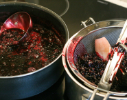 Bobule bazy odoberieme od stopiek, umyjeme a odvážime 2,5 kg. Rovnako pripravíme aj čučoriedky. Ovocie rozvaríme a precedíme. Do scedenej šťavy pridáme cukor, otvorenú a vanilku aj so semiačkami a klinčeky, privedieme do varu a ešte 10 minút povaríme. Nepridávame žiadnu vodu !