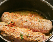 Potom panenky z marinády vyber a osuš ich. V panvici s hrubým dnom rozpáľ jednu lyžicu olivového oleja a panenky na ňom opeč z oboch strán. Pridaj marinádu, teplotu zníž na polovicu a nechaj ich v nej variť ešte 14 minút.