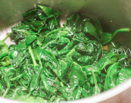 Medzitým v hrnci rozpáľ jednu lyžicu olivového oleja a pridaj po hrstiach špenátu. Miešajúc špenát obvar a dochuť soľou a korením. Keď je mäso hotové, odlož ho nabok, ale drž ho v teple.