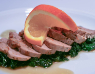 Panenku nakrájaj na tenšie plátky. Na zohriate taniere daj najprv vrstvu špenátu, na tú ulož plátky mäsa a to prelej šťavou z mäsa. Dozdob plátkom pomaranča a okamžite podávaj.