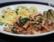 Fantastický bravčový Stroganov bez kečupu a s bezlepkovými cestovinami.