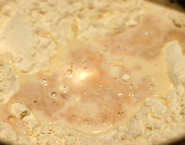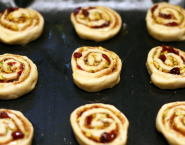 Z preosiatej múky a ostatných surovín spracujeme cesto, ktoré necháme 30 minút kysnúť na teplom mieste. Vykysnuté cesto vyvaľkáme na obdĺžnik asi 4mm hrubý, potrieme tak fajne rozpustenou herou a celý povrch cesta posypeme pistáciovo- cranberry plnkou.