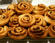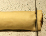 Zrolujeme a krájame na asi 1,5 cm – 2cm hrubé kúsky. Tie poukladáme na ležato na pomastený plech, pomastíme, necháme ešte 15 minút podkysnúť a pečieme do červena pri 180°C.