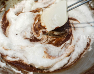 Vyšľahaj spolu vajcia, mandľovú zmes 50/50 a múku, zmiešanú s kakaom, do nadýchaného cesta. Z bielkov a cukru vyšľahaj tuhú penu a primiešaj ju k mandľovej zmesi. Nakoniec do cesta krátko zamiešaj rozpustené maslo.