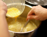 Cibuľku pokrájaj na jemno a opraž na masti, alebo oleji. Pridaj pretlačené strúčiky cesnaku, chvíľku popraž, zapráš paprikou a zalej vodou. Pridaj na malé kocky nakrájané zemiaky a priveď do varu. Keď polievka vrie, pridaj kocku zeleninového bujónu a tymián, zníž plameň a nechaj vrieť, až sú zemiaky mäkké. Teraz polievku rozmixuj ponorným mixérom. Vajcia v miske trocha rozšľahni, za stáleho miešania ich prilej do polievky. Polievku nechaj ešte 5 minút vrieť a dochuť soľou a korením.