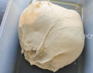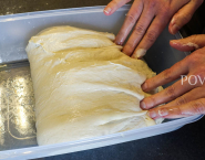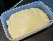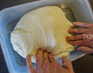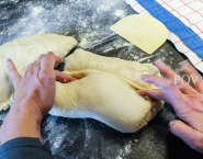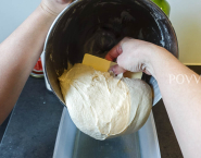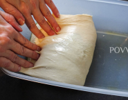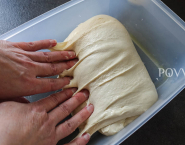 Cesto teraz veľmi opatne “prelej” do naolejovanej misky, kde ho natiahni do obdĺžnika a zlož z každej strany (viď foto), potom ho prikry a nechaj kysnúť 45 minút na teplom mieste.