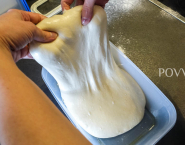 Po správnom premiesení je cesto tekuté, ale samo sa odliepa od misy a nie je príliš lepivé a hlavne: je nádherne vláčne – ako krém; a aj tak vyzerá (viď foto).