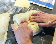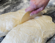 Pracovnú plochu dobre posyp múkou a cesto na ňu veľmi opatrne vyklop. Vôbec sa ho rukami nedotýkaj. Nakrájaj ho spatulou na kúsky o rovnakej hmotnosti (buď dva väčšie kusy, alebo niekoľko menších). Začni tým, že každý kus cesta najprv z kratších strán, jemne vytiahni do obdĺžnika ako pred prvým kysnutím, prelož a konce zlož do prostriedka. Poslednú stranu prelož k sebe a cesto na konci jemne postláčaj. Chiabbaty prelož na pomúčenú utierku, stlačenou stranou nahor a nechaj ho kysnúť ďalších 45 minút.