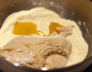 Všetky suroviny na prvé cesto daj spolu do misy a zmies ich do hladkého, homogénneho cesta a to ťahavými pohybmi cesta od seba. Nakoniec cesto zmies do bochníka a nechaj ho kysnúť cca.45 minút prikryté pod vlhkou utierkou, na teplom mieste a bez prievanu.