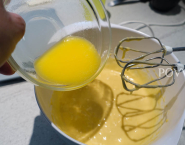 Mixérom zmiešaj múku spolu s práškom do pečenia, pridaj cukor s citrónovou kôrou, soľ, šľahačkovú smotanu a nakoniec vajcia. Miešaj 30 sekúnd a primiešaj roztopené maslo. Nakoniec, ak chceš, primiešaj aj 2 cl rumu. Ja som ho tu vynechala úplne.