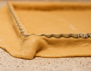Vychladené cesto rozváľaj na doske na rovnakú hrúbku. Valčekom ho prenes na tortovú formu s minimálnou výškou stien aspoň 4 cm hoog a dobre ho pritlač po stranách. Prebytočné cesto z okrajov popritláčaj hánkami rúk, aby od formy ľahko samé odpadlo.