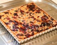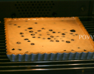 Formu vyloženú cestom naplň čučoriedkami a vlož do rúry predhriatej na 190°C (teplovzdušné rúry -20°C). Až teraz čučoriedky zalej pripravenou plnkou tak, aby ňou boli prikryté. Tortu nechaj piecť aspoň 25 minút.