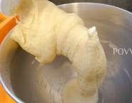 Všetky cestoviny okrem masla vlož do kuchynského robota s hnietačom a nechaj na malej rýchlosti hniesť najprv počas 2 minút a potom na strednej rýchlosti počas 6 minút.
