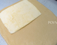 Po hodine rozváľaj vychladené cesto do obdĺžnika, veľkého približne 50 x 20 cm a asi 1 cm hrubé. Rovnako rozváľaj maslo v papieri na pečenie na obdĺžnik veľký 33 x 19 cm (viď foto nižšie). a rozdeľ na polovice. Prvú polovicu masla polož na cesto tak, aby si ho druhou tretinou cesta prikryla. Dbaj, aby bolo dobre uložené a siahalo takmer ku krajom.