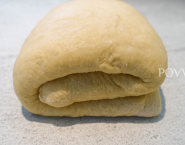 Potom cesto prelož na jemne pomúčenú dosku, kratšou stranou k sebe. Rozváľaj ho na obdĺžnik o veľkosti 50 x 20 cm, ako predtým. Rozváľané cesto prelož na tretiny ako obálku, znova vlož do igelitu a na hodinku do chladničky. Tentp proces zopakuj ešte dvakrát.