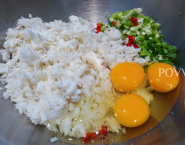 Rybku potom pretlač vidličkou a vlož do misy. Pridaj najemno nakrájané cibuľky, na drobno nakrájanú kapiu, strúhaný syr, uvarenú a vychladnutú ryžu, strúhanku a vajcia. Všetko dobre premiešaj a ochuť soľou a korenie.