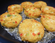 Z masy vytváraj dukáty a tie obaľ jemne v strúhanke. Potom ich opeč na troške oleja v panvici.