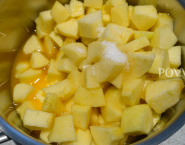 Medzitým z jabĺk odstráň jaderníky a olúpaj ich. 3 jablká nakrájaj na stredne veľké kúsky a vlož ich do hrnca spolu so zvyškom masla, pohárom pomarančovej šťavy (nie džúsu), 3 PL vanilkového cukru a plátkom citrónovej kôry (ten z citróna olúp škrabkou na zemiaky). Jablká v hrnci prikry a nechaj na miernom plameni podusiť 15-18 minút. Potom ich stiahni zo sporáka a nechaj vychladnúť.