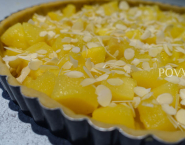Polovicucesta vyváľaj na veľkosť formy a vložho do nej. Na cesto porozdeľuj pripravené, vychladnuté jablká a posyp ich mandľovými stružlinkami.