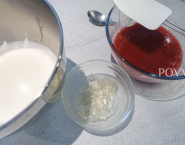 Želatínové plátky namoč na 5 minút do studenej vody. Nechaj ich rozpustiť s troškou vody v mikrovlnke a primiešaj k egrešovému pyré. šľahačku vyšľahaj do polotuha a primiešaj k egrešovo-želatínovej zmesi.