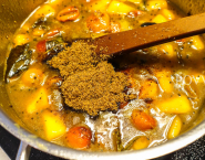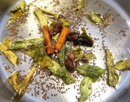 V panvici na miernom plameni rozpáľ olej. Stiahni plameň a do oleja vlož horčičné semená, kardamón, klinčeky, kari lístky a zlomenú, škoricovú tyčinku. Korenie v oleji popraž asi 1-2 minútky, alebo kým horčičné zrnká začnú pukať ako pukance.