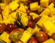 Potom ku koreniu pridaj prepichnuté egreše a nechaj všetko spolu variť asi 5 minút. Až potom pridaj mango. Dobre spolu premiešaj a nechaj chvíľku podusiť. Potom pridaj cukor, med, javorový sirup a bazalkový krém.