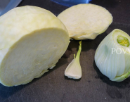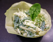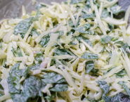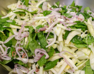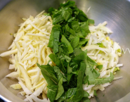 Kapustu, fenikel aj šalotku nakrájaj na jemné rezance, špenát na hrubšie. Všetko spolu zmiešaj v mise a dochuť soľou a korením.