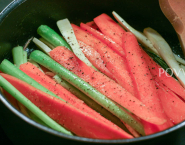 Paštrnák a mrkvy ostrúhaj a nakrájaj na tenké plátky. Listy zeleru odrež a stonky nakrájaj na dĺžku mrkvy. Pripravenú zeleninu podus na 1 PL masla spolu s bobkovým listom a rozmarínom met. Dochuť soľou a korením.
