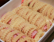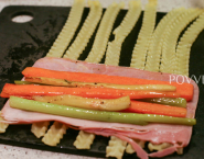 Cestoviny Mafalde povar 2 minútky v slanej vode. Opečenú zeleninu rozdeľ na porcie. Každú porciu najprv zaviň do plátkov šunky a potom do cestovín. Obalené ich ulož ich na olejom vymastený pekáč a prelej smotanou. Medzery medzi jednotlivými rolkami posyp nastrúhanými orechami a nastrúhanou kôrou z 1/2 citróna. Nakoniec zalej cestoviny zvyšnou smotanou, posyp ich zvyškom strúhaného syra, orechami aj citrónovou kôrou. Pripravené cestoviny vlož do rúry a peč 20-25 minút.