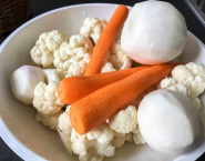 Zeleninu umy, karfiol porozdeľuj na menšie ružice, mrvku aj vodnicu najprv olúpaj. Mrkvu prekroj po dĺžke na polovice a potom každú na 4 časti. Vodnicu prekroj ako keby si ju štiapala ako poleno – z každej by si mala mať 8 ks- mesiačikov.