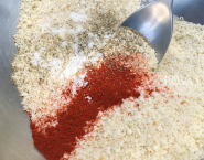 Olivový olej nalej do misky. Do ďalšej, trocha väčšej misky, vlož parmezán, strúhanku, sušenú petržlen.vňať, papriku, soľ a korenie a dobre spolu zmiešaj.