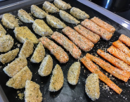 Karfiol, mrkvu aj vodnicu najprv omasti v olivovom oleji a potom vyváľaj v parmezánovej zmesi. Obalenú zeleninu prelož na papierom, či fóliou na pečenie vyložený pekáč. Peč ju počas 30 minút v predhriatej rúre.