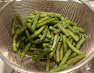 Fazuľky umy a konce fazuliek odrež. Var ich v osolenej, vriacej vode počas 3 minút. Opláchni ich pod studenou vodou, sceď a nechaj odtiecť. Fazuľky som mala zamrazené ešte od leta, tak som použila tie.