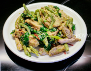Mäsko nakrájaj na tenké plátky – ja som použila zvyšky z jahňacieho stehna →. V kuchynskom robote alebo za pomoci ponorného rozmixuj lístky mäty, Pecorino, pistácie, malinový ocot a olej do hustého, hladkého dressingu. Dochuť ho soľou a korením. Cibuľky očisť a každú nakrájaj na 3 časti. V panvici rozpáľ trochu masla, ulož naň cibuľky, posyp ich práškovým cukrom a podus cca.3 minútky, až cukor začne karamelizovať. Púpavkový šalát nasyp do misy, pridaj jahňacie mäsko, fazuľky a cibuľky a premiešaj.