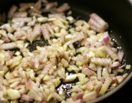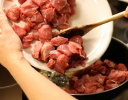 Tuk necháme rozpáliť v hrnci a opražíme na ňom do mäkka na drobno nakrájanú cibuľu. Keď cibuľa zmäkne, pridáme všetko korenie okrem soli a chvíľu spolu popražíme. Pridáme na kocky nakrájané mäsko, posolíme, zvýšime plameň a mäso opražíme až do jeho úplného zafarbenia.