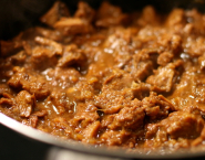 Pridáme odkôstkované a nakrájané datle (tie sú povinné, lebo ich tam dávame ako základ a zahusťovadlo omáčky), zalejeme pivom, alebo ľubovoľnou kombináciou ovocnej šťavy a vody a privedieme do varu. Keď začne mäsko vrieť, stiahneme plameň na minimum a necháme 2 hodiny dusiť.