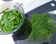 Všetky bylinky nasekaj a vlož do vyššej nádoby. Pridaj olivový olej, citrónovú šťavu, syr pretlačený cesnak a ponorným mixérom rozmixuj najemno. Dochuť soľou a korením a drž bokom až do podávania.