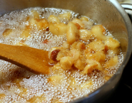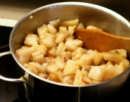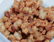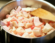 Slaninu nakrájaj na kocky o veľkosti 2×2 cm. Do kastróla vlej vodu a pridaj nakrájané kocky slaniny a na miernom ohni ich vytápaj, až sa škvarky začnú sfarbovať do ružova.